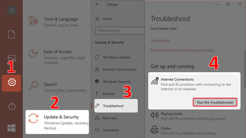 Hướng dẫn thực hiện: Mở Cài đặt > Chọn Update & Security > Chọn Troubleshoot > Chọn thành phần mà bạn muốn sửa lỗi, nhấn Run the troubleshooter.