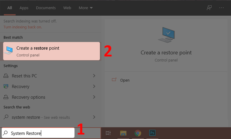 - Bước 1: Tại thanh tìm kiếm của Windows, tìm từ khóa "System Restore" > Chọn Create a restore point.
