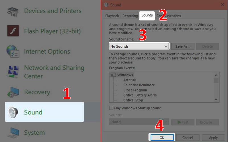 Tắt hiệu ứng âm thanh dễ dàng bằng cách: Bạn mở Control Panel, chọn Sound > Mở thẻ Sounds > Dưới dòng Sound Scheme, ấn vào mũi tên sổ xuống và chọn No Sounds > Nhấn OK.