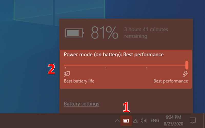 Hướng dẫn mở tùy chọn nguồn điện: Nhấn vào biểu tượng viên pin ở góc cuối bên phải màn hình > Chọn "Best performance" để sử dụng nguồn điện với hiệu năng cao.