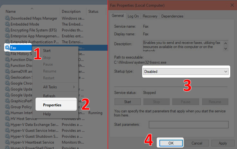 - Bước 2: Chọn dịch vụ mà bạn muốn tắt, nhấn chuột phải > Chọn Properties > Tại dòng Startup type, ấn vào mũi tên sổ xuống và chọn Disabled > Nhấn OK.