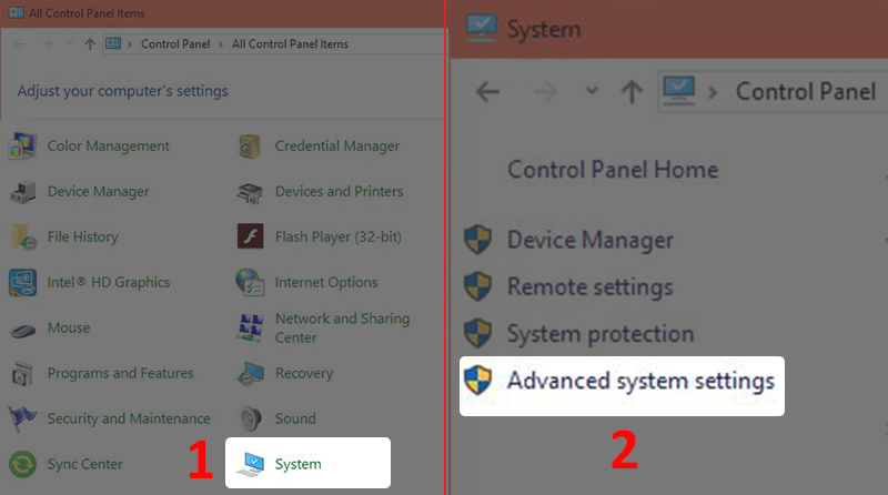 - Bước 1: Mở Control Panel, chọn System > Chọn Advanced system settings.