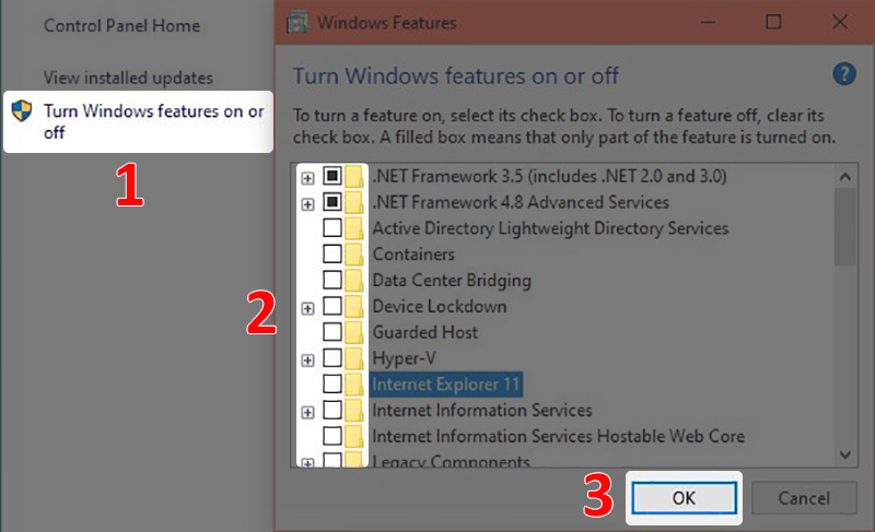 Hoặc bạn có thể mở Control Panel, chọn Programs & Features > Chọn Turn Windows features on or off > Bỏ tích các ứng dụng và tính năng không sử dụng > Nhấn OK.