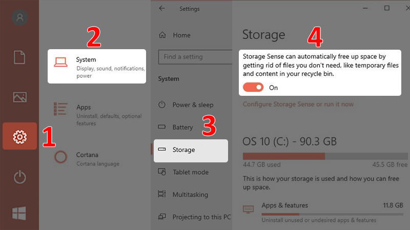 • Sử dụng tính năng Storage Sense: Mở Cài đặt > Chọn System > Chọn Storage > Bật On cho tính năng Storage Sense
