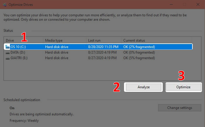 - Bước 2: Chọn ổ đĩa bạn muốn chống phân mảnh > Chọn Analyze, chờ hệ thống kiểm tra (Kết quả cho thấy ổ C có tỉ lệ phân mảnh là 2%) > Chọn Optimize để thực hiện chống phân mảnh và đợi đến khi hoàn tất.