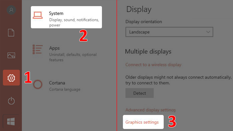 - Bước 1: Mở Cài đặt > Chọn System > Trong phần Display, chọn Graphics settings.